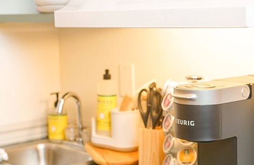 - Kitchenette (mini fridge, countertop portable stove burner, cooking supplies, Keurig, Starbucks & Dunkin’ Donuts coffee, snacks)