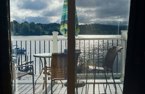 Rare find! Unit overlooking Wolfeboro Bay and Wolfeboro town docks with amazing views! Unit has a queen bed and queen sofa bed. Watch fireworks from the balcony when there are shows or watch the majestic Mount Washington dock in town. Central location so that you can walk to restaurants, shops and ice cream places in town. Two blocks from the Yum Yum shop! There are kayaks and paddle boats for use, along with amenities at the main resort campus (indoor pool, tennis, games and more).