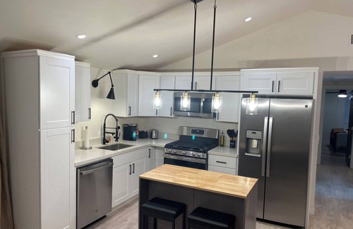 Newly renovated kitchen comes fully equipped and nicely appointed with quartz counter tops and new stainless steel appliances. Coffee machine kcup. Family room has smart tv for relaxation and enjoyment.