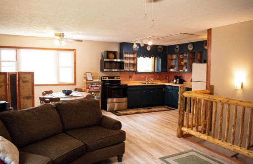 Our lakeshore gives you easy access to trails from either the driveway or when the lake freezes right from our yard. During the summer our lakeshore is equipped with a dock. Kayaks are available for use. If you would like a canoe or two; please ask and they can be made available. There is a public water access down off Hwy 7 about 8 miles if you bring your own boat. You can park your boat at the dock on the property.