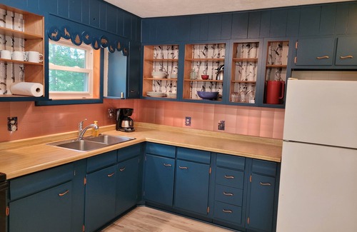 Once you arrive, you’ll find the cabin inviting and ready to enjoy. Because of the construction our grass has not grown back yet. We have some landscaping to do to make the outside more user friendly but still a great place to unwind. The cabin was built in 1970 and we have worked to upgrade it. The main cabin has two bedrooms (Master bedroom has a comfortable king bed and the second bedroom has two twin beds that could be put together to make another king bed), a fully equipped kitchen, dining and living room upstairs and a game room in the basement. There is also a futon in the basement. We have a TV/VHS/DVD player and many movies; but no WIFI yet. You’ll have minimal cell reception, but a hot spot works if you were to bring one. There is a patio down by the dock overlooking the lake and lots of area to play games. Bring some of your favorites.