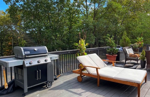 While the natural beauty surrounding our location takes center stage, we haven't compromised on comfort inside the apartment. The unit features a fully-stocked kitchen, beautiful living spaces, comfortable bedrooms, and breathtaking views of the mountains. The master bedroom offers a king-sized bed, while a twin bed nook provides additional sleeping for a friend or little one. The spacious living room is perfect for relaxation and quality time with loved ones. Modern-day conveniences and high-quality furnishings enhance your stay, including a reclining sofa and armchair, a king-sized bed with an all-natural, chemical-free Tempur-Pedic mattress, a private entrance, spacious desk with a view of the woods (perfect for remote work), washer/dryer, airfryer/toaster oven, coffee machine, and even a popcorn maker. A large TV with access to popular streaming services such as Netflix, Amazon, and Hulu, as well as strong Wi-Fi, cater to your entertainment needs.