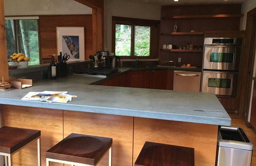 Locally known as The Octagon because of its various window faces and architecturally unique elements, our two- acre hillside haven is one-of-a kind. As you enter, you will be enveloped by pines, birch trees, and moss covered boulder facades, bordered by a pond and seasonal stream. The hillside forest ecosystem can be seen from various heights and perspectives from within the two sprawling light-drenched levels of the house itself. The main floor of the top level of the house has one main bedroom with bathroom ensuite, second bedroom with bunks, a fully-equipped chef’s dream kitchen with generous slate countertops, custom cabinets , multiple bar spaces, and updated appliances, and adjoining open-floor dining room with fireplace and living room for entertaining off the kitchen. Also on the main floor, next to the dining room, is a convenient deck for barbecuing featuring tree top and mountain views. On the upstairs balcony, is a reading nook with desk and pull out futon, next to the enclosed master king sized bedroom, perched alongside an old fir, giving you the impression of sleeping in a tree house. The lower level of the house is nicely separated for large groups to enjoy. Off the balcony stairs is a pod suite and walk in shower. All bathrooms feature radiant heat with slate floors. On the ground floor is the Octagon's Great Room with 30' high ceilings, exposed wooden beams, wet bar, foosball table, massive fireplace, large sectional sofa, and fiber optic TV. The Great Room allows easy access to an additional deck and the backyard with fire pit and seasonal brook. Off the Great Room are two other bedrooms, including the master "guest suite" with its own fireplace, porch and private entrance.