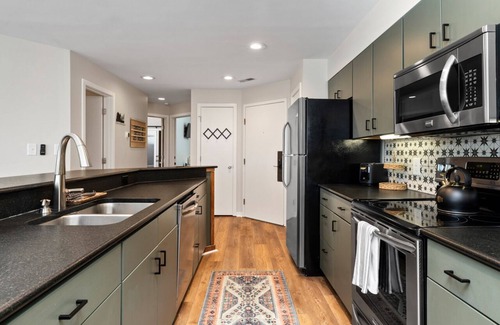 There is plenty of space to spread out with the 4 counter seats, dining table that seats up to 8, and a large living room with couch, love seat, recliner, and daybed. The main outdoor space is the deck off of the dining room overlooking the ski slopes that has a table with seating for 4. The kitchen is equipped with stainless steel appliances and is very well appointed with all the tools you need to make a home cooked meal or manage take out from one of the nearby (and amazing) restaurants.