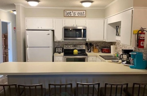 The kitchen is totally equipped with all the essentials, including crock pot, coffee maker, pots and pans, a built in microwave, dishwasher and everything that you need for your vacation.
