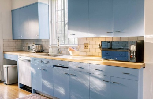 An additional upstairs bathroom has another stand-up shower with stunning cobalt blue tile work.