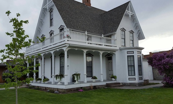 The perfect getaway in this restored Historic Home. The Wisdom House is the oldest home in Baker City, est. 1878. It is in the Heart of Downtown Historic District just walking distance to shops, restaurants, museums, parks and so much more. This Historic Home features 4 bedrooms. Bed #1 is on the Main floor with a Queen Bed; Bed#2 is on the 2nd floor has a King bed. Double glass window/doors lead onto the balcony. Bed #3 is on the 2nd floor with a Queen Bed. It has doors leading out to the balcony. The upstairs 2nd floor bedrooms open up onto a Balcony overlooking Downtown Baker City. The siting area on the 2nd floor has a full size sofa which is a hide-a-bed. Leading up the steps to the 3rd floor is the Bed #4 which the entire floor is an open concept with 4 single beds and aa 3/4 size bed. Two of the beds on the 3rd floor are antiques. One is said to have come on the Oregon Wagon Trail. There is a eat-in kitchen with a gas free standing fireplace in the corner. Adjoining is the dinning room and next to it is the living room. Both the living room and dining room proudly display window balances original to the house from 1878. There are two bathrooms. One is located on the main floor and the 2nd bathroom is on the 2nd floor. The upstairs bathroom features a claw-foot bathtub and Plush bathrobes are provided for your comfort in the bathroom armoire. This home has Central Air-conditioning for those hot days. Free Wireless Internet. Flat screen televisions are provided, with Roku, Netflix, Hulu, other free steaming channels. The downstairs Frame TV has a DVD' player as well as set up for local channels..