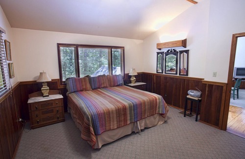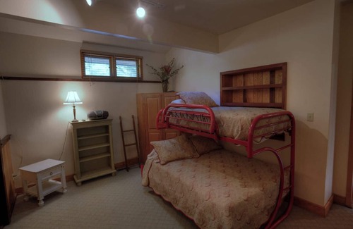 Wits End Lodge is a 3 bedroom craftsman style lodge at the end of the road on 65 private acres. This lodge has rolling pastures, a small pond and trails though the woods. Enjoy you nights on the large patio with a fire in the native stone fireplace. There is a 8 person Hot Tub beside the fireplace. Inside the lodge you will find 3 bedrooms that feature 2 king beds. 3rd bed room with adjoining bath now has Queen bed (picture shows bunk) it sleeps 2. There is a queen sleeper sofa in the loft. There is a full kitchen and large dinning area. Warm up next to the soap stone wood stove in the living room and watch sattelite tv upstairs or down. Both TV's are now flat screen. There are 3 bathrooms and upstairs bath has oversized jetted tub.