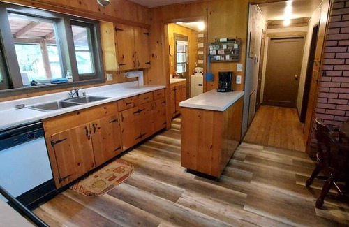 The Main House sets high on a hill overlooking the 100,000+ acre National Park. It has two bathrooms, 2 large bedrooms, 4 queens,in one, 3 queen beds in second The living room has a sleeper sofa and two day beds. All towels and linens are furnished. There, central AC/heat and a fully equipped kitchen. There is a screened in porch, large deck, picnic tables, BBQ grills (charcoal) horse shoes and volleyball/badminton. The yard area is landscaped with rock gardens and natural beauty all around.