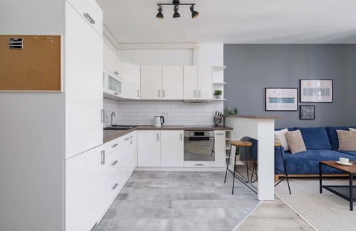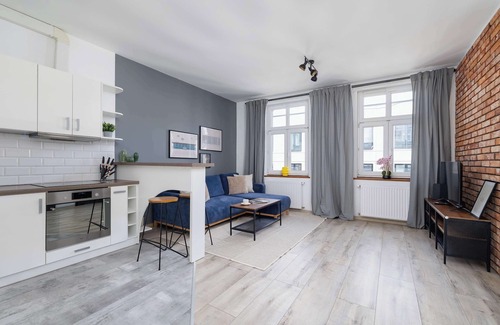 A stylish apartment in a historic tenement house on Wojewódzka Street, this space was created for guests seeking comfort, character and a prime location. Spanning 41 m², the layout is perfect for families, business travellers or visitors attending events at the iconic Spodek arena. In the living room, a striking exposed brick wall combined with bright kitchen cabinetry and modern accents creates a unique interior character. A comfortable sofa bed serves as an additional sleeping space, while the Smart TV with internet access invites you to unwind with your favourite shows after a busy day. Large windows fill the space with natural light, enhancing its cosy atmosphere. The kitchen counter offers a great spot for breakfast, a cup of coffee or working on a laptop – especially with the fast Wi-Fi connection provided. The kitchenette is equipped with a modern induction hob, oven, electric kettle, fridge with freezer and dishwasher, allowing for convenient meal preparation. In the separate bedroom, a comfortable double bed with soft bedding ensures restful sleep and regeneration, while the thoughtful layout fosters a peaceful atmosphere. A modern bathroom with a spacious shower encourages relaxation – fluffy towels and a complimentary set of toiletries provide hotel-level comfort. An additional asset is the utility room, where guests will find a washing machine, iron, ironing board and a standing clothes dryer – particularly useful for longer stays. Completing the space is a desk, offering a comfortable work area for professional duties. This apartment combines functionality, aesthetics and location, making it an ideal choice for any stay in Katowice – whether for leisure or business.