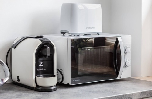 A kettle, a coffee machine, an induction hob, an oven, a dishwasher, a fridge with a freezer, glasses, a set of pots, cutlery, frying pan