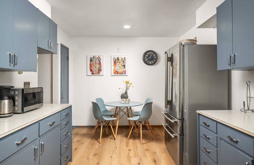 Inside, there's something for everyone. The lower level of the home features a fantastic game room with a retro flair—complete with a pool table, foosball, darts, and plenty of seating for guests of all ages to unwind and play. On the split middle level, you’ll find the main living area, dining space, and kitchen. The home is a stylish mix of vintage charm and modern upgrades, and every piece of furniture and décor has been newly curated to create a space that’s both welcoming and memorable.