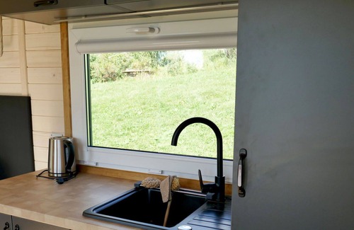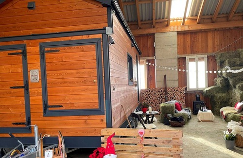 Erschwil 9 km from Leuk Stadt: Modern, cosy, comfortable mobile home "Schlaf beim Schaf", 1'250 m a.s.l built in 2022, surrounded by meadows. On the outskirts, in a secluded, quiet, sunny position on a slope. Private: natural state property. Patio. Breakfast possible on request. Pre-arrival grocery service. Narrow motor access (mountain road). Parking. Grocery 550 m, restaurant 650 m, bus stop 600 m, railway station "Leuk" 7 km, thermal baths "Leukerbad" 18 km. Golf course (18 hole) 13 km, walking paths from the house 1 m, skisport facilities 12 km. Nearby attractions: Roggen-Zentrum Erschmatt, Stockalperschloss Brig. Well-known ski regions can easily be reached: Zermatt, Saas Fee. Hiking paths: Leuker Sonnenberge, Leukerbad - Torrent. Please note: car recommended. On the estate animal husbandry. Local sale of farm products. The Tiny House is located in the pasture, surrounded by sheep, chickens, horse and pony.