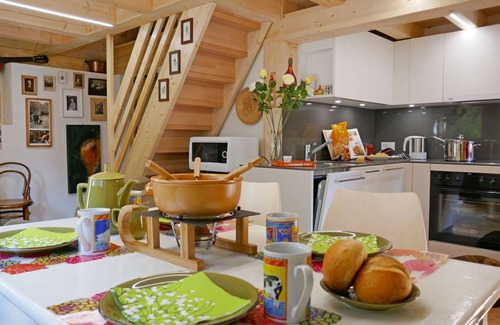 "Rustico Ginetta", 3-room house 60 m2 on 2 levels. Partly with sloping ceilings, fully renovated in 2018, comfortable and cosy furnishings: open living/dining room with open-hearth fireplace, satellite TV, flat screen, radio, CD-player and electric heating. Exit to the terrace. 1 double bedroom with 1 double bed (2 x 90 cm, length 200 cm). Open kitchen (oven, dishwasher, 4 ceramic glass hob hotplates, microwave, electric coffee machine, raclette grill, fondue Set (chinoise, cheese)). Shower/WC. Electric heating, wood heating. Upper floor: (steep stair) open gallery with 2 beds (80 cm, length 200 cm). Patio. Terrace furniture, barbecue, deck chairs (2). Beautiful view of the mountains and the forest. Facilities: washing machine, children's high chair, baby cot for up to 2 year olds (extra), hair dryer, logs (extra). Please note: suitable for families. Non-smoking house. Maximum 3 pets/ dogs allowed. Fire extinguisher. Two way road, real time 20 minutes. Instead of an enclosed bedroom, some sleeping areas are located in an open-plan area (gallery, alcove, etc.). NL-00003126
