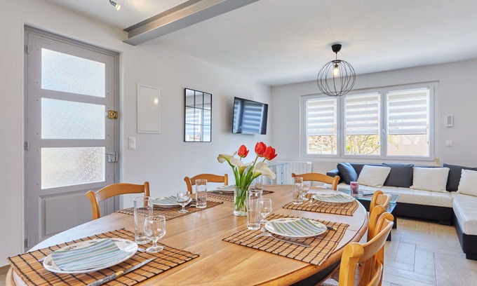 Janomaine is a cozy, comfortable single-family house that has been renovated in 2023. Situated in the resort of Cabourg, France, it offers a tranquil setting just 100 meters from the town center and 250 meters from the sea and beach. The property features a fenced yard, a lawn garden, a terrace with outdoor furniture, a barbecue area, and parking for two cars, making it an ideal holiday rental for those seeking a relaxing getaway.