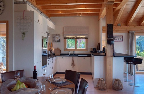 The chalet is equipped with various amenities to ensure a comfortable vacation experience. It has a washing machine and dryer for your convenience. Additionally, there is free WiFi internet access available. The chalet also offers reserved parking and a garage that can accommodate up to two cars, with a height of 220 cm and a width of 520 cm. Furthermore, you will find a fully-equipped kitchen with an oven, dishwasher, five induction hot plates, a toaster, a kettle, a microwave, a freezer, an electric coffee machine, Nespresso capsules (extra charge), a raclette grill, and a fondue set (chinoise and cheese).