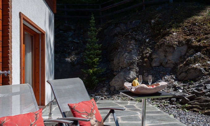 The chalet features four bedrooms and three bathrooms, providing ample space for up to eight guests. One room has a double bed (2 x 90 cm, length 210 cm), a shower, a WC, and a double hand-basin, with access to the terrace. On the upper floor, there is one room with two beds (90 cm, length 210 cm) and a shower/WC, as well as two additional rooms, each with two beds (90 cm, length 210 cm). The upper floor also has a bath/shower/WC. The chalet offers a large terrace with both north and west-facing positions, allowing you to enjoy the beautiful panoramic views of the mountains. Outdoor furniture, including terrace furniture and two deck chairs, is provided for your convenience. Please note that the chalet is not suitable for small children under six years old and is a non-smoking property.