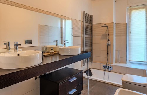 5-room villa 200 m2 on 2 levels. Modern furnishings: open large living/dining room with dining table and TV. Exit to the garden. 1 room with 1 bed and 1 double bed. 1 double bedroom with bath/shower/bidet/WC. Open kitchen (4 hot plates, oven, dishwasher, microwave, freezer, electric coffee machine). Exit to the patio. Bath/bidet/WC, double hand-basin. Upper floor: (open staircase) living room with sloping ceilings with 1 bed, TV and fan. 1 double bedroom. Shower/bidet/WC. Gas heating (extra). Heating available only from 01.10. to 30.04. Terrace 12 m2, roofed, patio roofed. Terrace furniture. Facilities: washing machine, baby cot, hair dryer. Internet (WiFi, free). Please note: smoke alarm, fire extinguisher. 10303500022