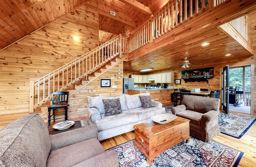 Nestled right on the banks of the river, this one-bedroom home is waiting to provide your next vacation with lots of happy memories! Inside, you'll find an expansive living space filled with lots of comfortable furniture, an all-wood interior, vaulted ceilings, and a wood-burning fireplace. You'll have two TVs to stream your favorite movies and shows on, so be sure to use the microwave to pop plenty of popcorn for the gang before snuggling up on the living room sofa for a night of entertainment. The full kitchen features all the small and major appliances the family chef will need and there's lots of counter space to work on when preparing delicious meals. Serve up to eight guests at the handsome wood dining table or take your plates out to the spacious deck to enjoy an al-fresco meal at the table/chair set or from the comfort of a good rocking chair. After dinner, let the dishwasher knock out all the cleanup while you head down to the firepit for an evening of toasted 'Smores and some terrific stargazing. The free WiFi will make it easy to research a fun outdoor adventure while the central AC and ceiling fans keep the home nice and cool.