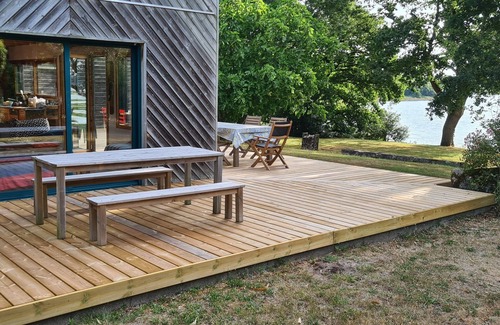 Contemporary wooden house, located on the banks of the Auray river, in an exceptional environment and a calm unanimously appreciated.