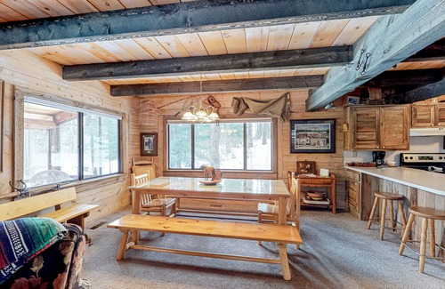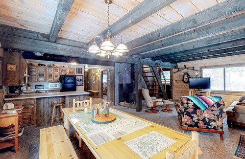 This two-level cabin is tucked away in a grove of evergreens three miles southeast of downtown McCall, offering the perfect blend of convenience and tranquility for golfers, hikers, skiers, and swimmers. Spend summer mornings swimming in Payette Lake and lounging on the beach at Legacy Park (three miles northwest), tee off at the McCall Golf Club (four miles north), and pass the winter months on the slopes of Brundage Mountain (13 miles northwest).