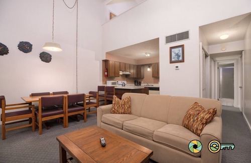 This unit has a traditional kitchen with convenient dining either at the eat-at kitchen bar or a dining area adjacent to the living room and kitchen. A washer/dryer is also located in the downstairs hallway closet. The living room features a cool retro-modern free-standing wood burning fireplace, rustic furnishings, a flat screen TV, and a sweeping vaulted ceiling up to the loft level. The downstairs bedroom includes a queen bed, walk-out access to the rear patio, and convenient access to the downstairs full bathroom. The large loft bedroom includes a queen bed, a bathroom with a sauna, access to the second-level balcony, and a TV. This home comfortably accommodates four but can sleep as many as six with the living room sleeper sofa.