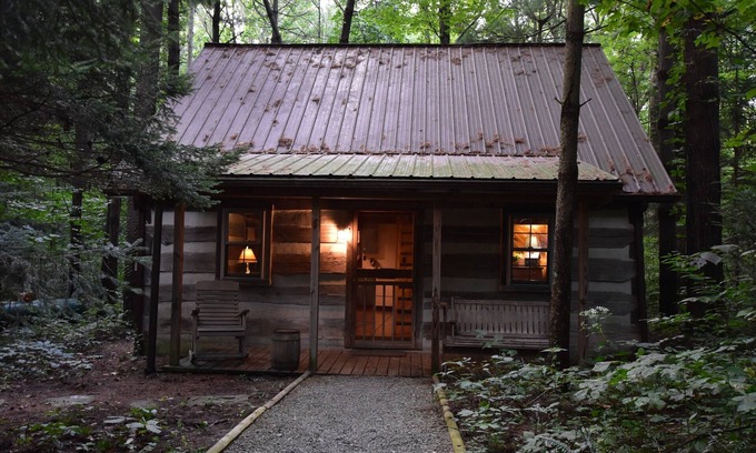 Romantic Authentic Style Log Cabins, Nestled in an Enchanting Pine Forest. Screened Porch with Private Hot Tubs, Fireplaces, Fully Equipped & Furnished. 58 Acres with Hiking Trail & Stocked Pond. Private & Secluded.
