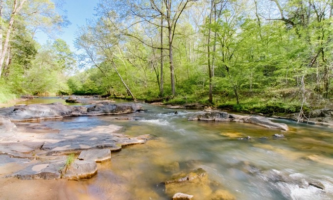 Eaton's Edge offers a smoke free downstairs apartment with exterior entrance, private drive, full kitchen, private laundry room and a home theater. With 20 acres of wooded seclusion, you can step out your door and relax next to the Cascades of Harris Creek, sit and watch deer and turkey in the yard, spot owls, bats and eagles overhead or build a campfire in the pit and listen to the sounds of rushing water and rambling freight trains in the distance. All this and only three miles to Walmart, Food Lion, Redbox and terrific pizza. Our road is one narrow mile of bumps, curves and hills!