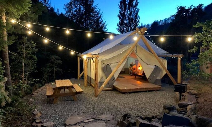 This gorgeous handcrafted tent is located in the Umpqua National Forest in Oregon. The tent itself was constructed with wood right from the property and boasts a sturdy water and fire-resistant canvas covering. A group of three guests can be accommodated in the spacious and stunning interior as there is a king-size bed plus a sofa bed. On the property, guests will also find shared bathroom facilities with hot showers and toilets.