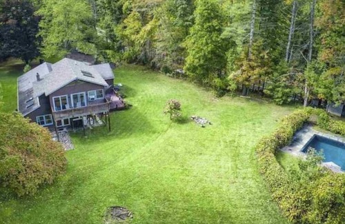 A true retreat, Set on 5 acres at the edge of Woodstock, the huge backyard is set up for relaxation and play. There is a stone firepit for use all year, and a gas grill just off the deck.