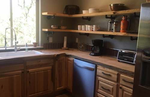Our beautifully wooded and private living quarters are above the shop on our 5 acre property. Walking distance to beautiful southern Oregon river and bridge and a perfect fishing hole! Just down the road from us are beautiful riverfront parks for picnics. The apartment has private entrance and stairs leading up to it. Open floor plan with 3 Bedrooms (1 King bed, 2 full beds),