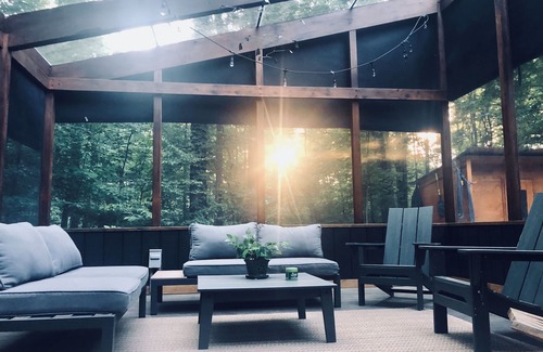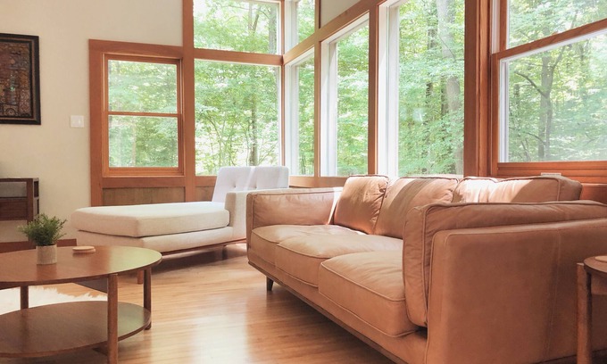 The Loll House is tucked away in the woods 500+ feet off the street on a 10 acre property just 70 miles from Chicago on the other side of the lake. This architect (LBBA) designed 3500 sq ft home is surrounded by trees. Even though it is secluded in nature and from neighbors, it is still only minutes from 3 public beaches and multiple towns. High speed internet for work or streaming.