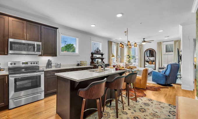 Welcome to Woodwind—your cozy Nashville retreat in the heart of The Nations. Stroll to Fat Bottom Brewing Co. for craft beers, pop into local cafés for pastries, or browse charming boutiques. Take a quick drive to Broadway's honky-tonks for live music, Vanderbilt for campus charm, or Germantown for award-winning dining. After your adventures, sink into the plush living room for a movie marathon, sizzle up something delicious in the kitchen, or retreat to the bedroom for a peaceful night's rest.