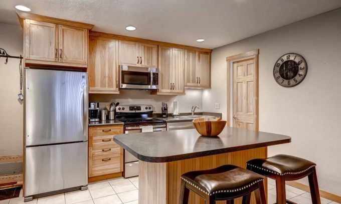 The fully equipped kitchen features stainless steel appliances and a large island—perfect for preparing meals after a day of hiking, biking, golfing, or relaxing by the pool. Step out onto the private patio for your morning coffee or fire up the grill for dinner under the mountain sky. Inside, the living room offers a queen sleeper sofa, recliner, in-unit air conditioning to stay cool during the day, and a gas fireplace to take the edge off cooler evenings.