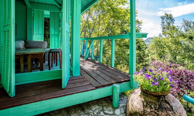 "Le Vallon du Brec" is a world renowned garden Located in the medieval town of Coursegoules in Provence Alpes-Martitimes. The 20,000 square meter property includes the "Remarkable Garden", a prestigious label award by the French Ministry of Culture and Communications. The gardens is open to the public by reservation, aim est aussi the private home of Mitchell and Nizar, and artist and garden enthusiast. The property includes 2 independent aussi private apartments for rent. Each apartment includes it's own private terrace, as well as shared access to The Many seating areas, perched cabana, ponds, pool, garden benches and hammock. All over looking at a gorgeous valley with no construction.