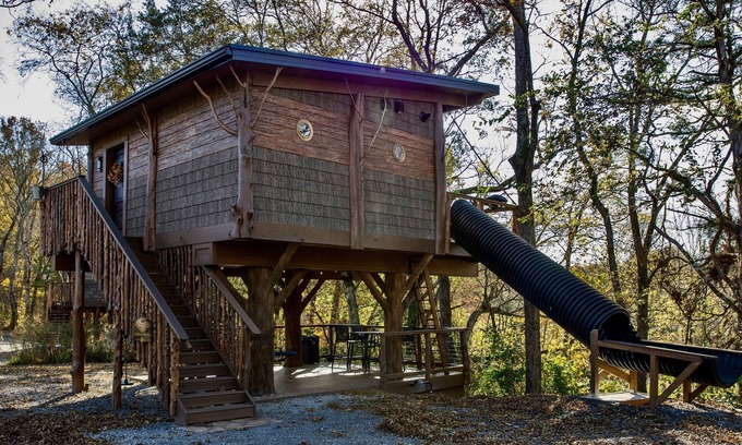 Squirrels Gone Wild has accommodations for up to 6 people with a King bed, 1 Queen secret roll out bed, and a set of bunk beds. With interactive features such as a 20-foot slide, drink chute, escape hatch, secret ladder, swings, custom made interactive furniture, rope climbs, bucket pulley and so much more! The treehouse has many surprises and promises to be your most unique vacation experience yet!