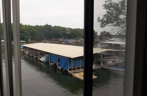 This wonderful 2 bedroom 2 bath condo has so much to offer. It is located at the end of Horseshoe Bend by land in a quiet residential area and at approximately the 9.5 mm of the main channel of the Lake of the Ozarks. It is only 5 steps up from the parking lot and is an end unit facing south. Upon entry you are welcomed by a combination kitchen, dining room and living room area. But your eyes will be drawn to the great view! The living room features new wood flooring, sleeper sofa (FOR 1 YOUNG CHILD ONLY, NO ADULTS ON SLEEPER SOFA PLEASE), two chairs, new flat screen TV, and decorative fireplace (not for use). The kitchen is well equipped with newer appliances. Your choice for seating for mealtimes includes a dinette set for 4, bar stool seating for 5 or high top patio set for 4 on the balcony. The master bedroom has a king size bed, flat screen TV and awesome view of the lake from floor to ceiling windows. There is a private bathroom in the master bedroom suite with tub/shower. The guest bedroom has a queen size bed and view of the lake. There is an adjacent guest bathroom with tub/shower. Utility room offers a full size washer and dryer. Your favorite place will undoubtedly be the balcony overlooking the main channel of the lake, swimming pool and hot tub! Relax while watching the family enjoy the pool right in front of you and the boats racing by! Sorry, but due to insurance, no grills of any type are allowed at the condo buildings.