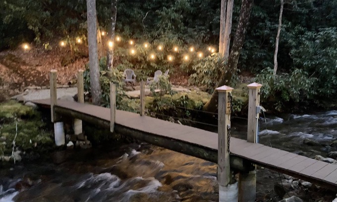The property borders the beautiful Nantahala National Forest of the Great Smoky Mountains and offers an abundance of exploration. Let the sounds of the rushing waters soothe your soul day and night. Walk across our bridge to enjoy bonfires or even pitch a tent for the night on our property across the river which is lit by festive cafe lights strung around the campfire. Hike through the Nantahala National Forest right out the backdoor. Or if you prefer the creature comforts, enjoy the fully equipped kitchen, comfortable new beds (King and Queen), new gas logs in our stone fireplace, Wi-Fi, large flat screen TV in the den and another in the King Bedroom with Dish Programming. Read a book or just gaze at the river from the sunroom/sleep porch with its comfortable oversized chairs and sofa which opens into a queen sleeper sofa. Enjoy family dining at the large dining table beautifully made of reclaimed barnwood.