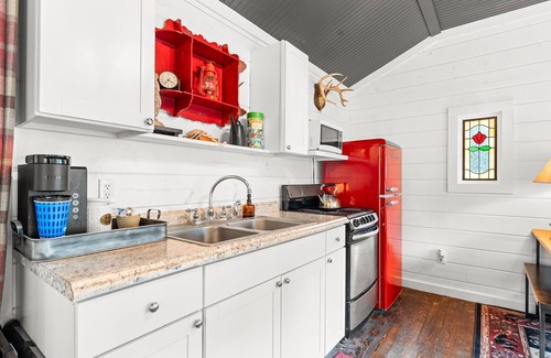 Whether you're planning a romantic escape for two 💑, a solo reset 🌿, or a cozy hideaway with your pup 🐶, this cottage is made for rest and reconnection. Inside, you'll find a queen bed 🛏️, a twin sleeper sofa 🛋️, and a thoughtfully styled interior with soft lighting, warm textures, and rustic charm. A galley kitchen 🍳 and dining table make it easy to cook or play cards, while the newly added hot tub ✨ is perfect for relaxing under the trees or beneath a starlit sky.