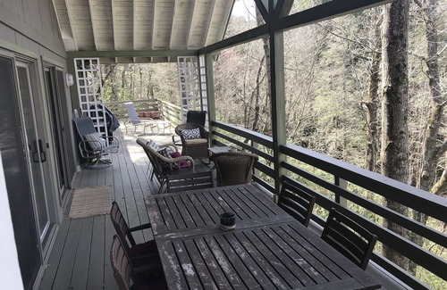 Come sit on the 100 foot deck and enjoy the fresh mountain air as the sun sets.....Or listen to waters cascade down the shoals from the audible waterfalls next door.