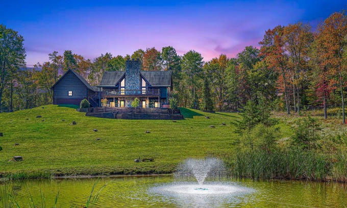 Plan your Hocking Hills getaway at Timber Ranch. This beautiful hand hewn log home offers plenty of seclusion with wooded nature views on 43 acres of property including a catch and release pond. Bring your fishing poles and your pet! Pet friendly with 3 private bedrooms plus sleeping loft and 3.5 baths. Comfortably accommodates up to 12 guests. Less than 5 miles from Route 33 and downtown Logan. Centrally located to the state parks and local area attractions. First floor master suite with King size bed, en-suite bath with soaking tub, and access to the screened in porch to enjoy your morning coffee with wooded and pond views. The loft bedroom is perfect for the family with two sets of twin over twin bunks and a children's play area. The finished lower level offers two additional bedrooms each with a Queen and twin bed. First and second floors have large stone wood-burning fireplaces. Enjoy the well equipped kitchen with JennAir appliances to prepare your meals. Relax after hiking with a soak in the private hot tub with outdoor patio seating. Timber Ranch offers complimentary WiFi and three flat screens with Roku in the great room, finished lower level, and Master bedroom. This is a restful retreat for friends and families to enjoy in the Heart of the Hocking Hills.