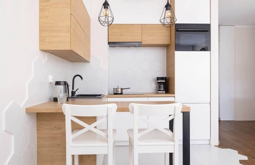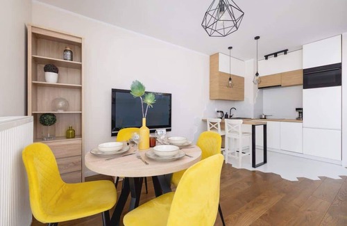 The apartment comfortably accommodates up to 4 people, providing privacy and tranquility, making it an ideal place for a romantic weekend for a couple or a family vacation. The 42 m² space is divided into a living room with a kitchenette, a separate bedroom, a bathroom with a shower, and a balcony. The interior exudes a warm atmosphere thanks to its pleasant color scheme and stylish decorative elements. The living room is furnished with a comfortable, fold-out sofa, making it a perfect place to rest and relax. From the living room, you can access a spacious balcony, ideal for enjoying your morning coffee or tea. The fully equipped kitchenette with high-quality appliances makes cooking a real pleasure. The bedroom features a comfortable double bed that ensures a good night's sleep. There is also a desk, which provides a convenient space for remote work or focused study. Multimedia equipment includes a flat-screen Smart TV and free Wi-Fi. The bathroom is equipped with a washing machine, increasing the comfort of long-term stays. At the beginning of each stay, we provide a complimentary set of toiletries, towels, and bed linen. Additionally, the reservation includes a parking space in the underground garage.
