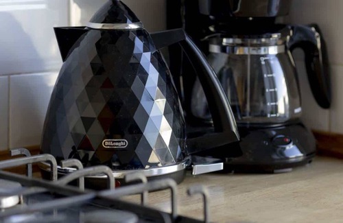 Gas stove, oven, dishwasher, toaster, drip coffee maker, refrigerator, freezer, electric kettle, table, four chairs, cabinets