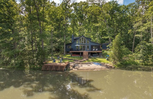 Outside, enjoy direct access to your own private dock and sandy beach area, complete with lake toys for hours of waterfront fun. In the evenings, gather around the lakeside fire pit for s’mores and stories under the stars. Whether you’re spending your days swimming, kayaking, or simply lounging by the water, this chalet offers the ultimate lakefront experience.