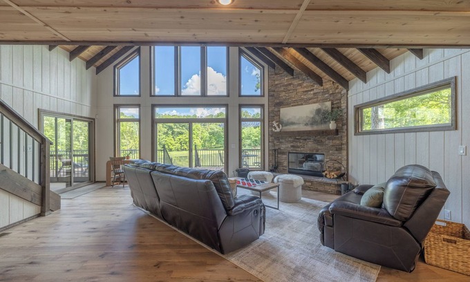 Escape to this stunning 3-bedroom, 2-bath chalet tucked away on the serene shores of Lake Wundersee within the beautiful Innsbrook Resort. Designed to comfortably sleep up to 10 guests, this modern yet cozy retreat is ideal for families, groups of friends, or anyone looking to relax in nature without giving up the comforts of home. Inside, you'll find a spacious, open-concept living area featuring a wall of oversized windows that flood the space with natural light, a striking floor-to-ceiling stone fireplace, luxury furnishings, and warm wood accents throughout. The fully equipped kitchen has everything you need to prepare meals at home, while the adjacent dining area offers plenty of space to gather and share them together.