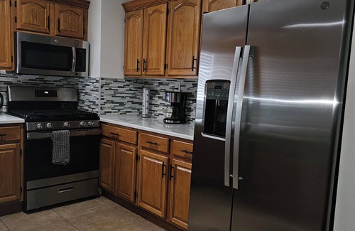 -Coffee maker, toaster oven and counter top kettle. Comfortable retreat. Self Check- In. Conveniently located near NYC major hubs. 5 min to JFK, 5 min to LIRR/Subway. 5 min to highway. 10 min to USB Arena. 15 min to Resorts Casino. Quick access to restaurants, supermarkets and malls. Shared Backyard/Outdoor Deck access. Ductless Remote AC units throughout. Board games for any age. Cable TV. Black out blinds, Safe, Quiet. Unusually Large Space.