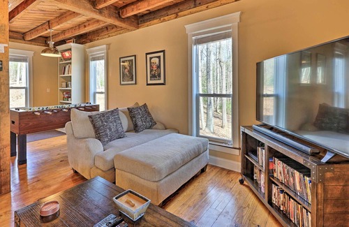 Escape to the Yadkin Valley at 'The K Reserve'! This 3-bedroom, 2-bathroom Union Grove cabin offers an idyllic stay in North Carolina's wine country, where your group can experience rustic elegance as you dine al fresco, watch movies, and cozy up by the fire. Venture out and you'll find fun for everyone — from the Swan Creek Wine Trail to fly fishing and skydiving. Visit Raffaldini Vineyards and Winery, shop at the Shiloh General Store, and top it off with a milkshake at Mason's Sweet Shoppe.