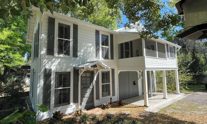 Get ready to relax in this 2-bedroom cottage in historic DeLand – walking distance to Stetson University and downtown DeLand shops, restaurants, and breweries. This unique property is filled with original art and boasts a charming atmosphere that will make guests feel right at home. On the first floor you’ll find a large living room, quaint dining area, and fully appointed kitchen. With one queen bed, one futon, one day bed, a rustic sitting/reading room, and screened in porch, there's plenty of space for everyone to unwind. The bathroom is clean and well-maintained, ensuring a perfect stay. Book now and enjoy everything this cottage has to offer.