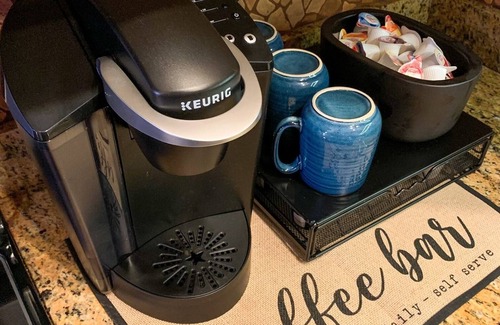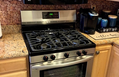 Kitchen: open concept kitchen with granite countertops and stainless steal appliances including: fridge, dishwasher, stove and microwave. Kitchen is fully stocked with dishes, pots/pans, bake wear, utensils, and Keurig with starter supply of k-cups,/creamer/sugar, standard coffee maker also available. We stock a variety of electric appliances including electric skillet, mixer, crock pot, waffle maker, etc.