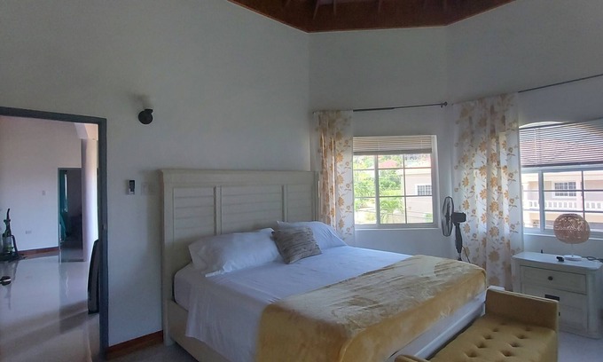 Yellow Summer is located 10 mins from the famous and busy tourist destination of Ocho Rios. It is approx 10 mins from the popular Plantation Cove. It's in close proximity to Mystic Mountain, Dolphin Cove , Pearly Beach, Fabtasy beach, Dunns River Falls and lot of local restaurants and night life. It's perched in a quiet gated community. The views from master bedroom window and roof top lounge is stunning. It's large, spacious living rooms and bedrooms makes it a haven for large families or groups. Private chef and transportation services are provided.